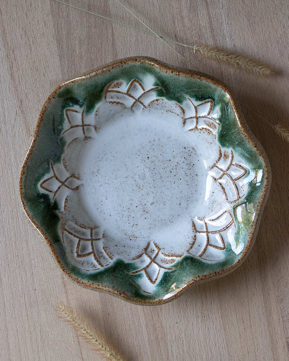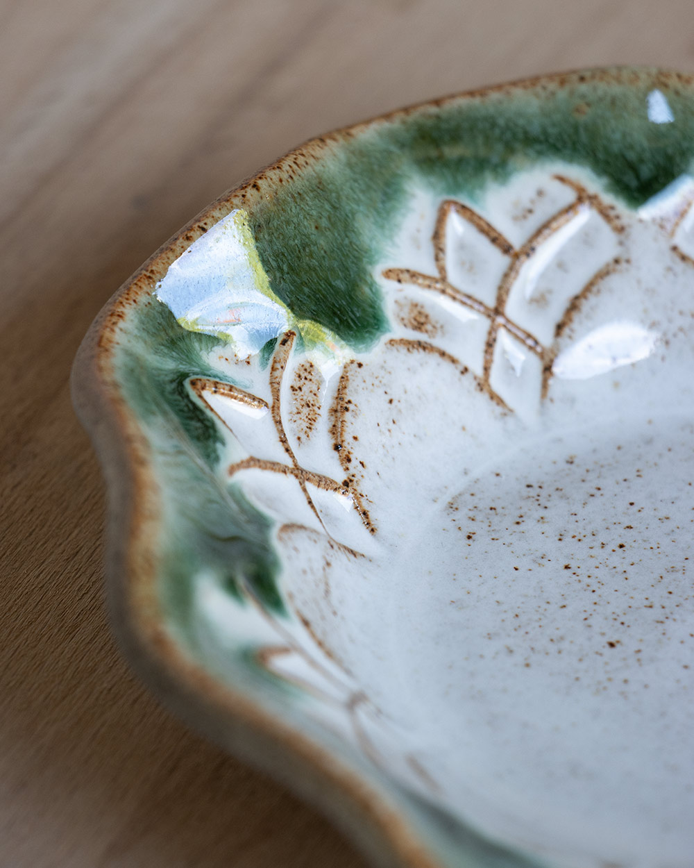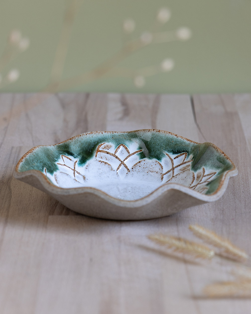 Das handgefertigte Schälchen ist mit der Plattentechnik und einem selbst geschnitzten Stempel entstanden. Das Muster wurde zunächst nach und nach in eine ausgerollte Tonplatte gestempelt. Diese wurde dann vorsichtig mit einem Gegenstück aus Gips in Schaumstoff gedrückt, um den Wellenrand zu formen. Das Schälchen ist perfekt für Eis, aber natürlich auch für andere Desserts, Salate, Snacks oder auch als Schmuckablage.