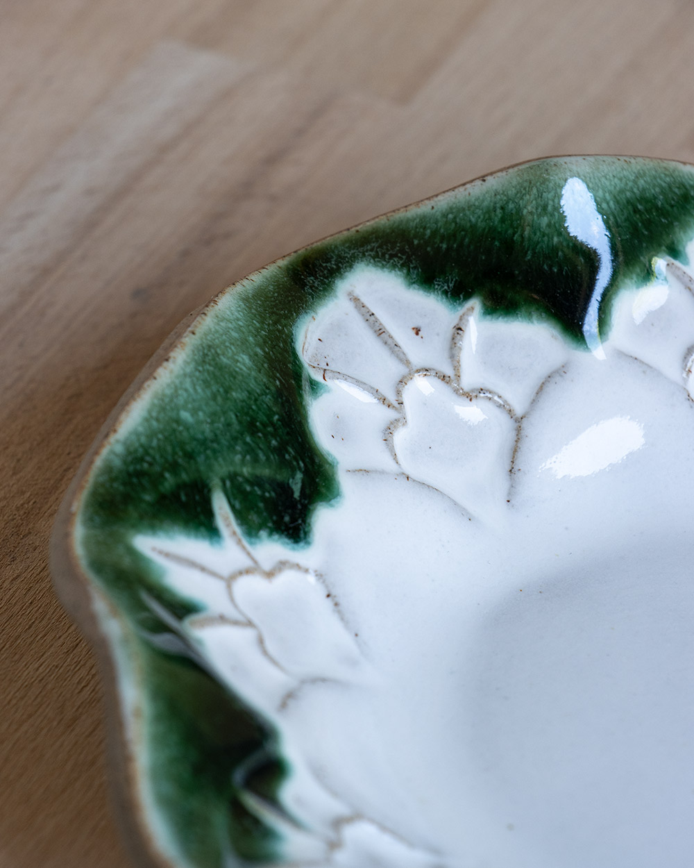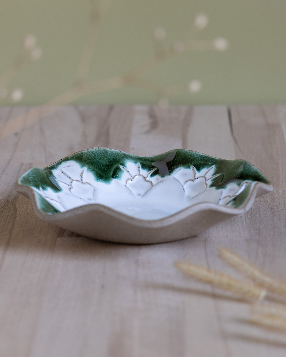 Das handgefertigte Schälchen ist mit der Plattentechnik und einem selbst geschnitzten Stempel entstanden. Das Muster wurde zunächst nach und nach in eine ausgerollte Tonplatte gestempelt. Diese wurde dann vorsichtig mit einem Gegenstück aus Gips in Schaumstoff gedrückt, um den Wellenrand zu formen. Das Schälchen ist perfekt für Eis, aber natürlich auch für andere Desserts, Salate, Snacks oder auch als Schmuckablage.
