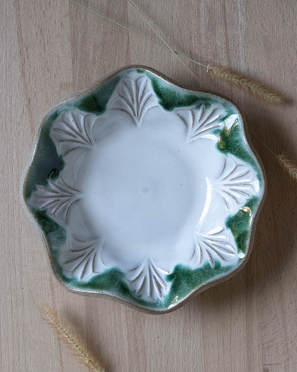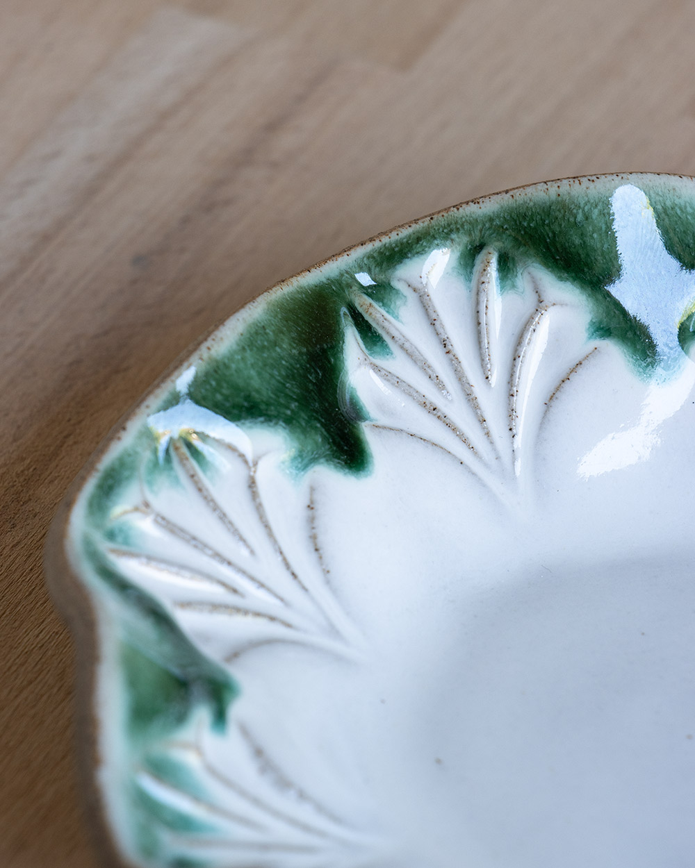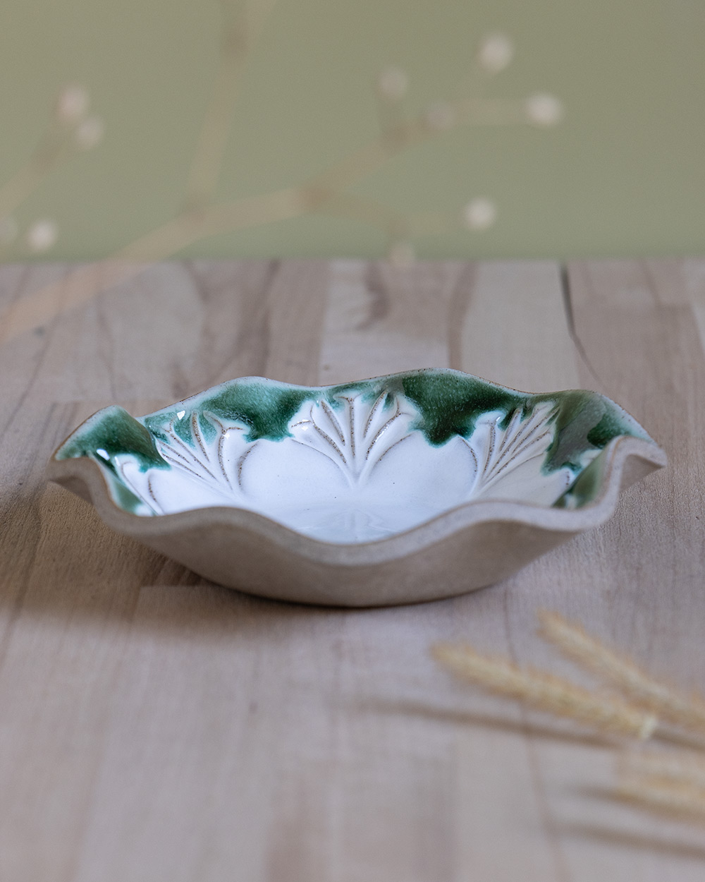 Das handgefertigte Schälchen ist mit der Plattentechnik und einem selbst geschnitzten Stempel entstanden. Das Muster wurde zunächst nach und nach in eine ausgerollte Tonplatte gestempelt. Diese wurde dann vorsichtig mit einem Gegenstück aus Gips in Schaumstoff gedrückt, um den Wellenrand zu formen. Das Schälchen ist perfekt für Eis, aber natürlich auch für andere Desserts, Salate, Snacks oder auch als Schmuckablage.