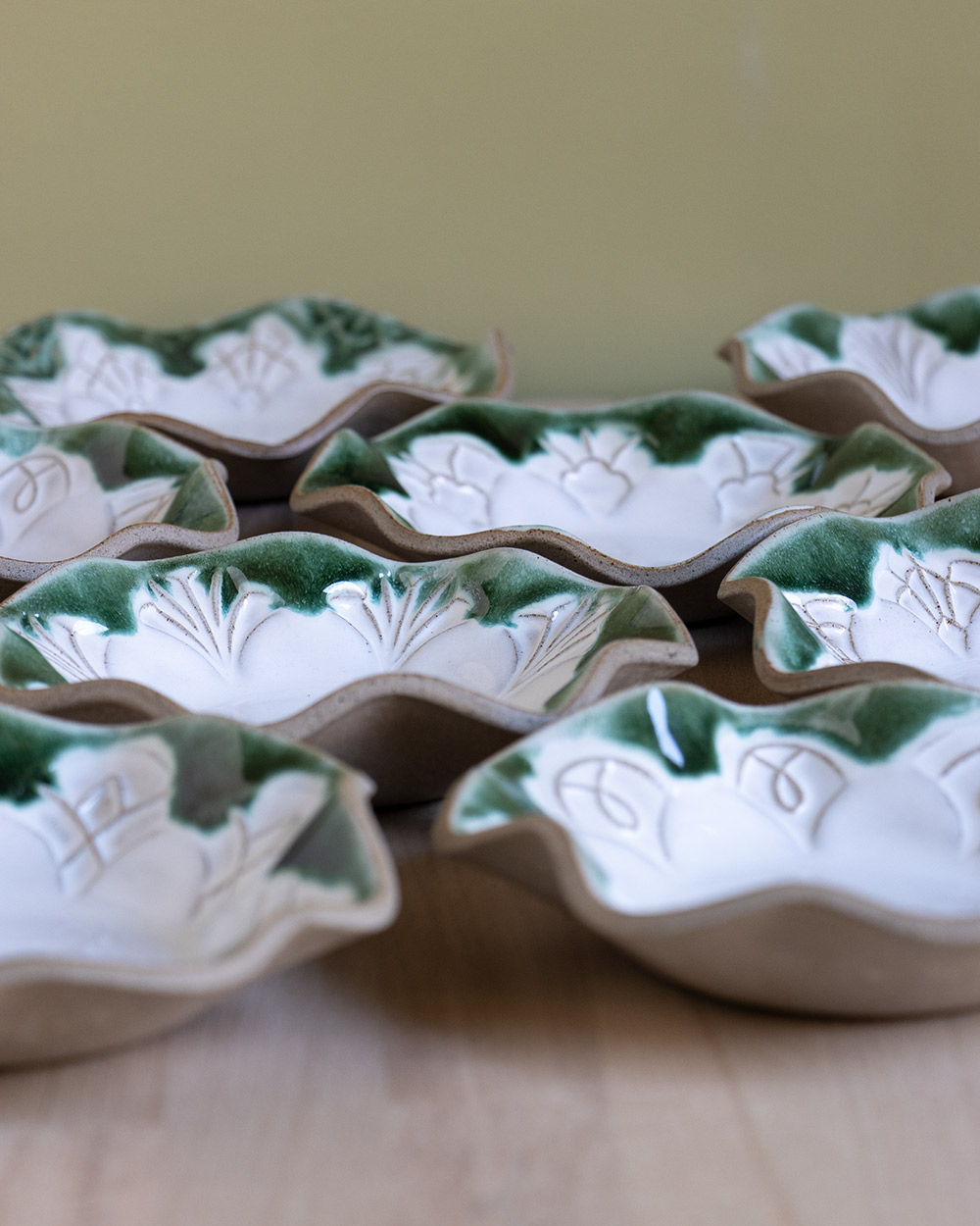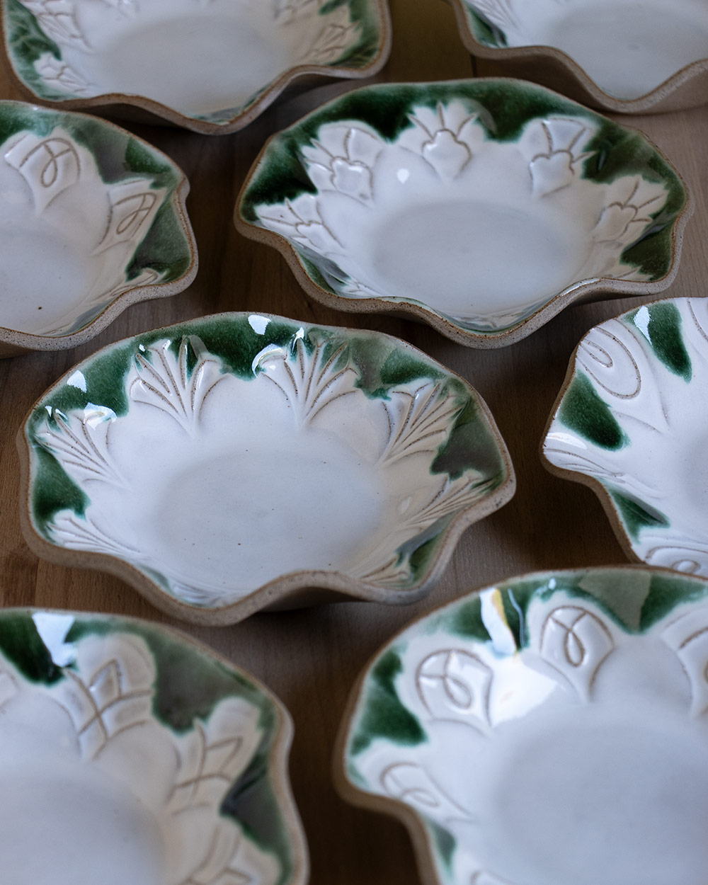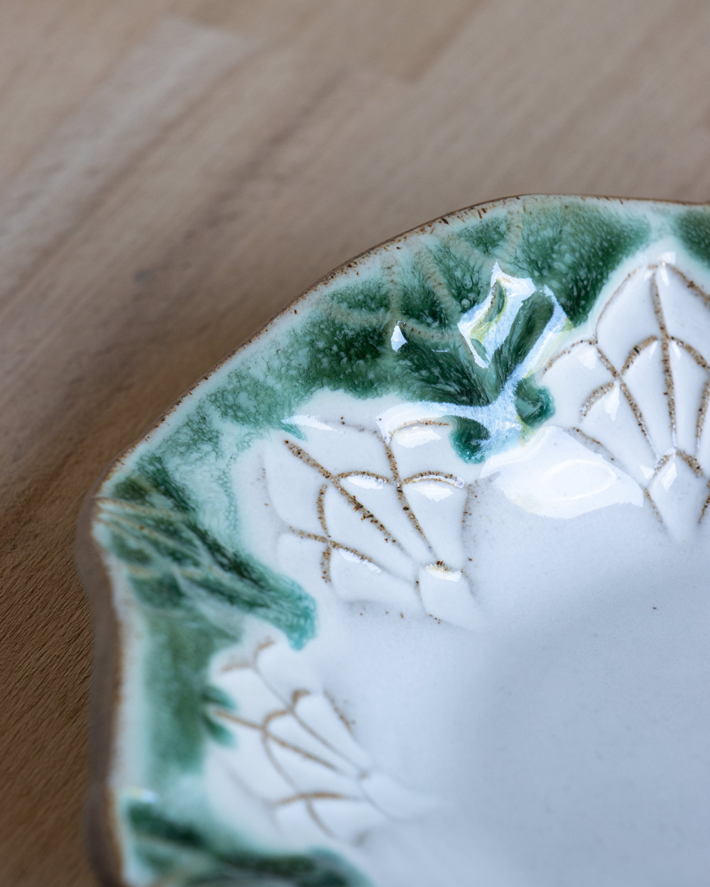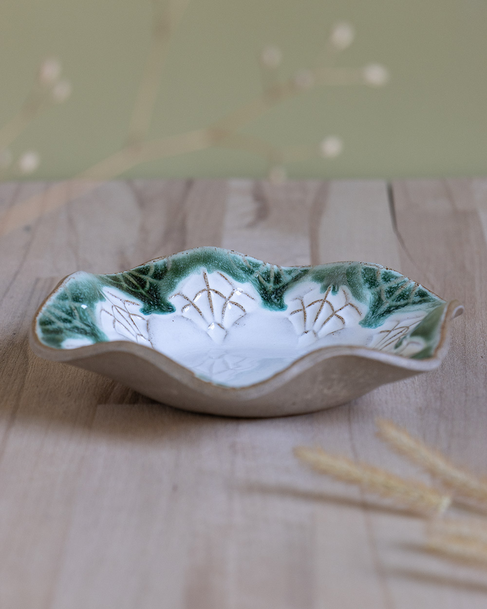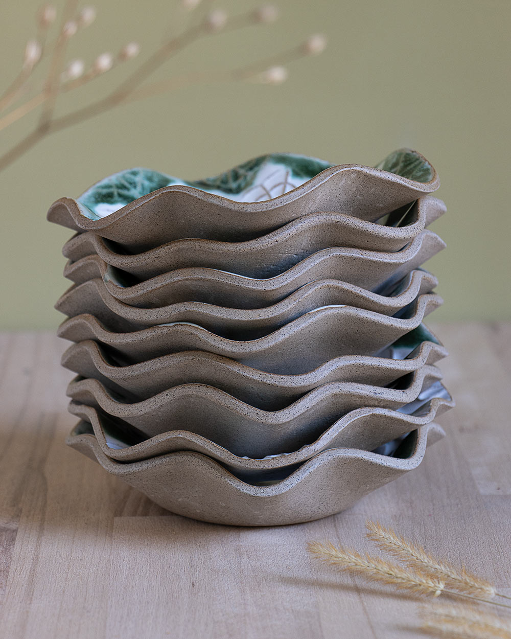 Das handgefertigte Schälchen ist mit der Plattentechnik und einem selbst geschnitzten Stempel entstanden. Das Muster wurde zunächst nach und nach in eine ausgerollte Tonplatte gestempelt. Diese wurde dann vorsichtig mit einem Gegenstück aus Gips in Schaumstoff gedrückt, um den Wellenrand zu formen. Das Schälchen ist perfekt für Eis, aber natürlich auch für andere Desserts, Salate, Snacks oder auch als Schmuckablage.