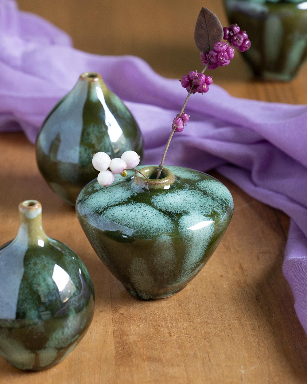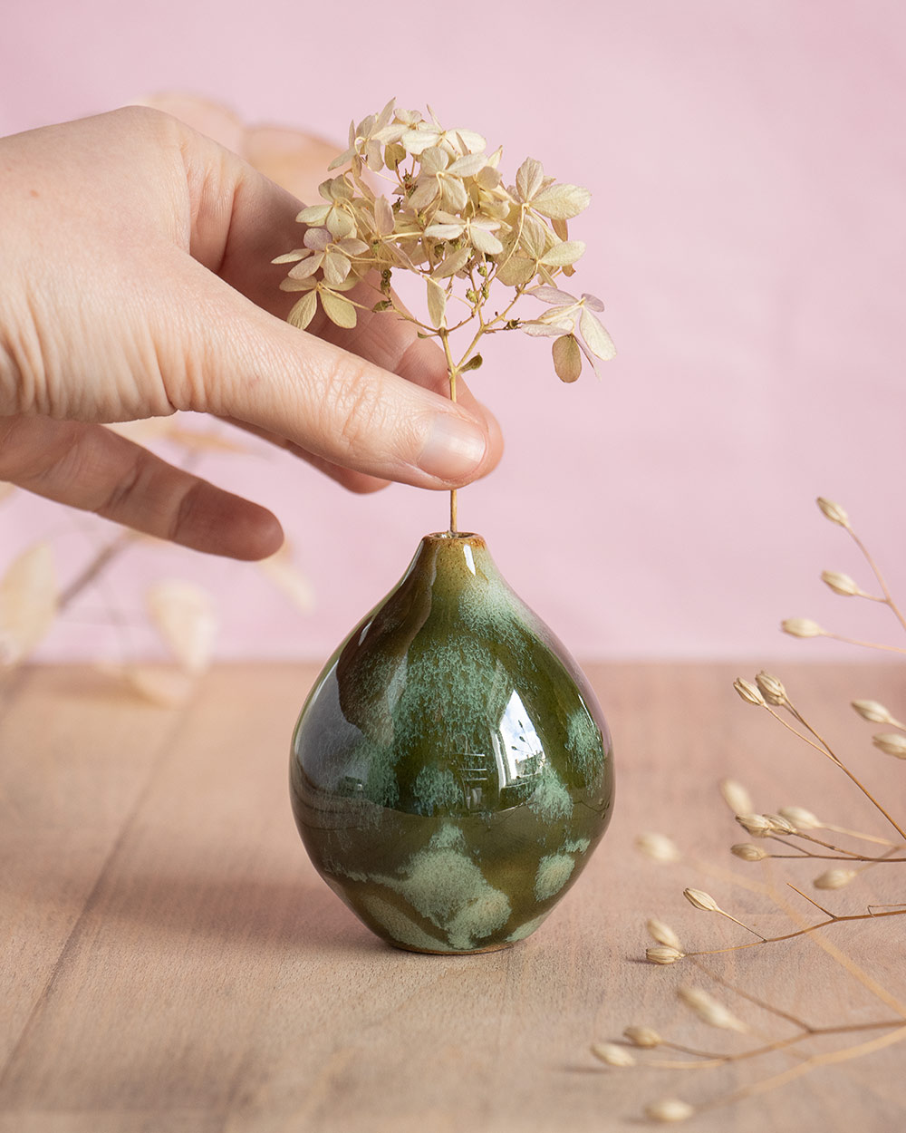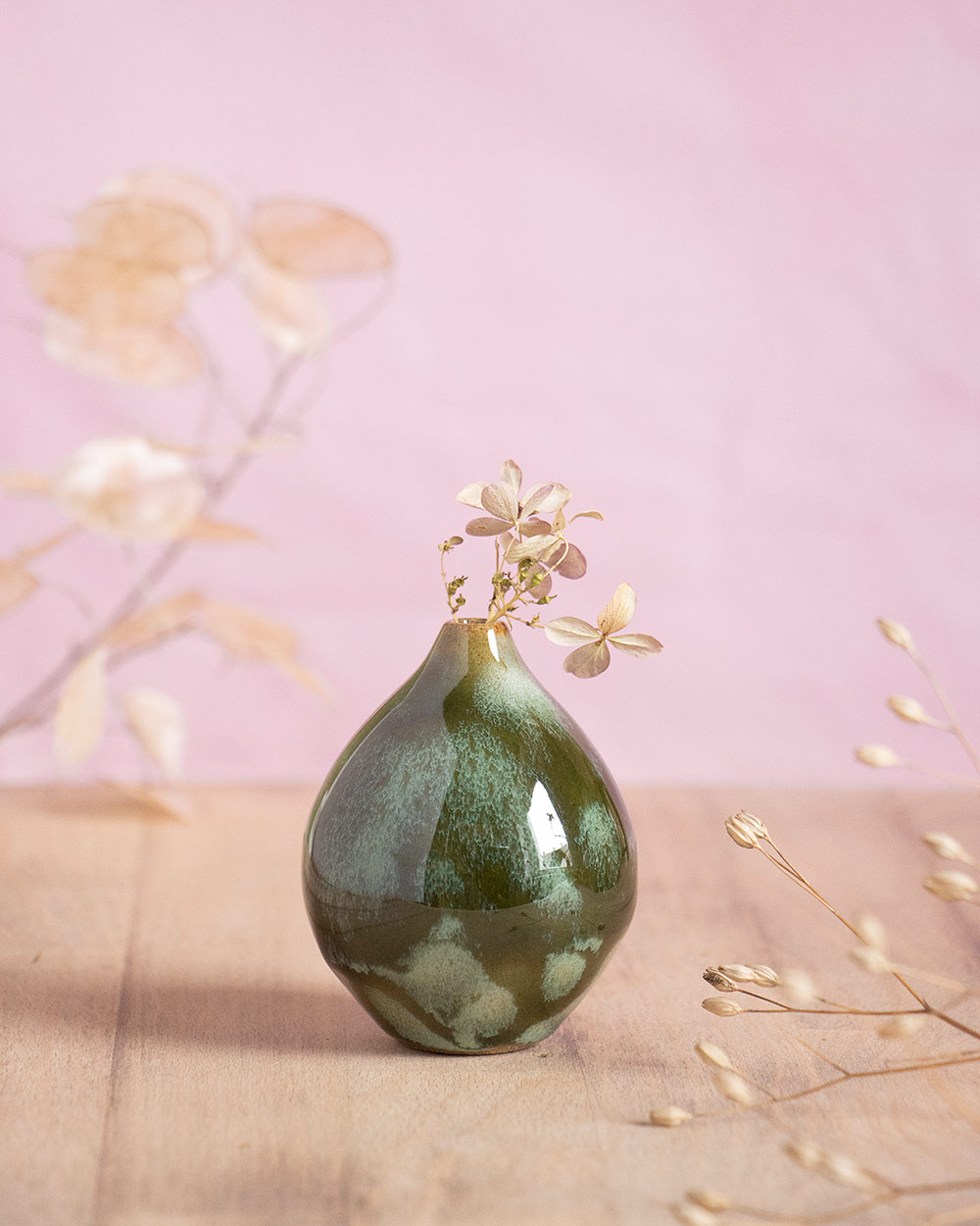 Der Frühling steht vor der Tür, Vorfreude! Diese kleine kugelige Vase wurde frei auf der Töpferscheibe gedreht. Sie ist perfekt für ein einzelnes Blümchen oder Ästchen. Jeder mint-grüne Glasurfleck wurde einzeln mit dem Pinsel aufgetragen. Das so entstandene, einzigartige Muster ist auch ohne Blumen ein besonderer Blickfang.