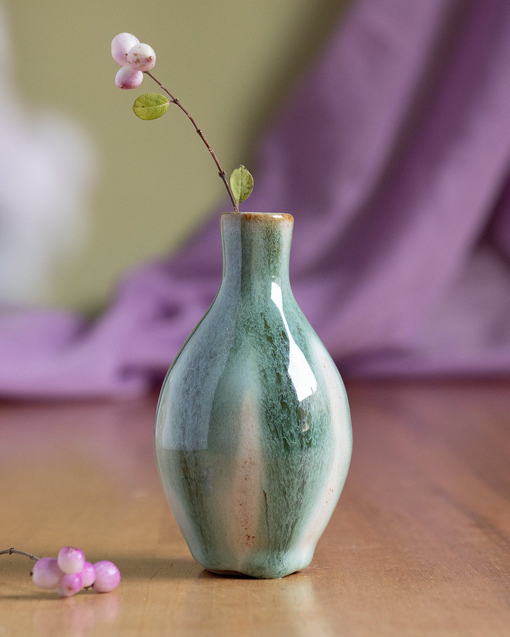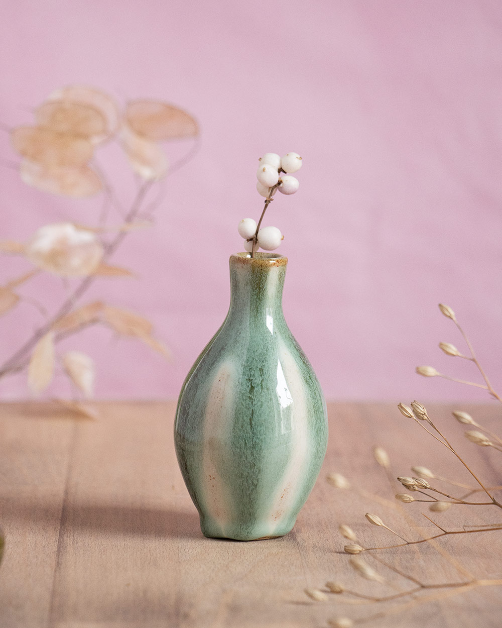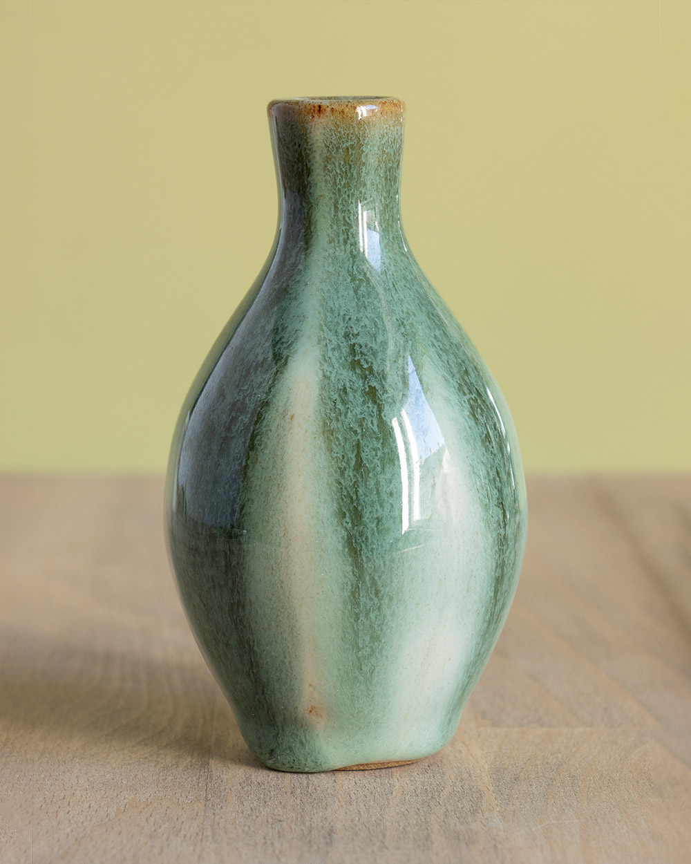 Der Frühling steht vor der Tür, Vorfreude! Diese kleine flaschenförmige Vase wurde frei auf der Töpferscheibe gedreht. Sie ist perfekt für ein, zwei Blümchen oder Ästchen. Die Glasur wurde abwechselnd in Streifen mit dem Pinsel aufgetragen und umfließt die Vasenform satt. Die so entstandene Oberfläche ist auch ohne Blumen ein besonderer Blickfang.