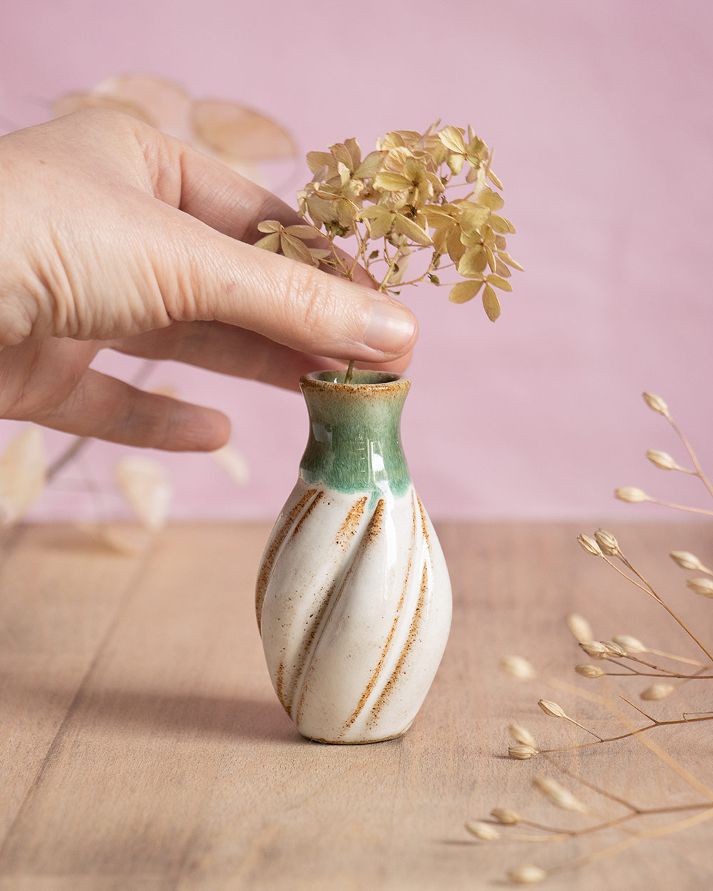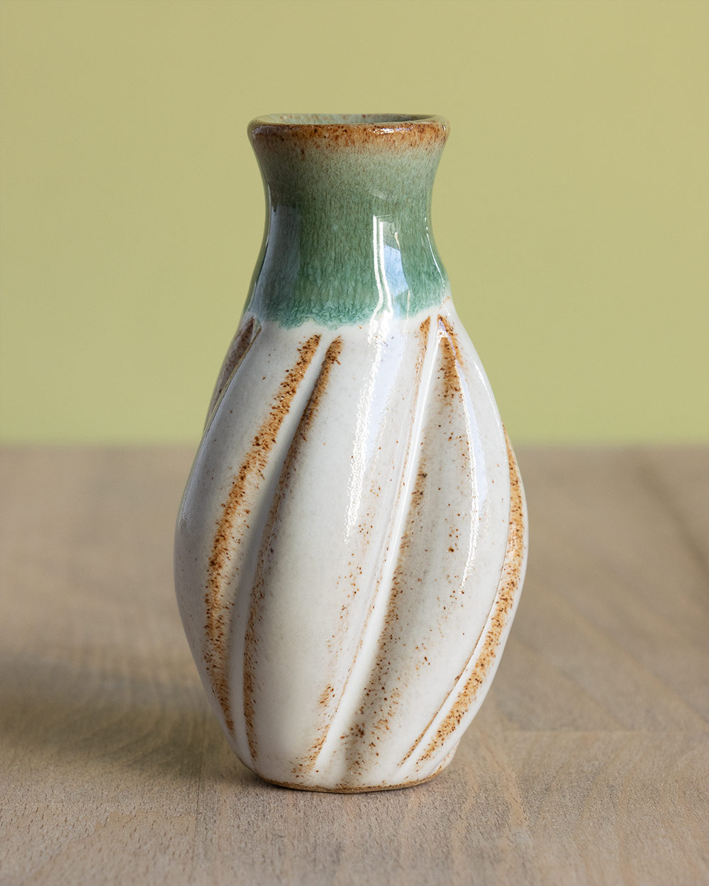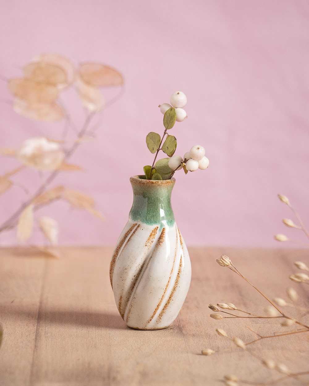 Der Frühling steht vor der Tür, Vorfreude! Diese kleine bauchige Vase wurde frei auf der Töpferscheibe gedreht. Nach dem Drehen wurde sie noch mit einem selbst hergestellten Werkzeug verformt bzw. spiralförmig eingekerbt. Sie ist perfekt für einen Ministrauß oder ein einzelnes Blümchen oder Ästchen. Ihre besondere Form macht sie auch ohne Blumen zu einem kleinen Blickfang.