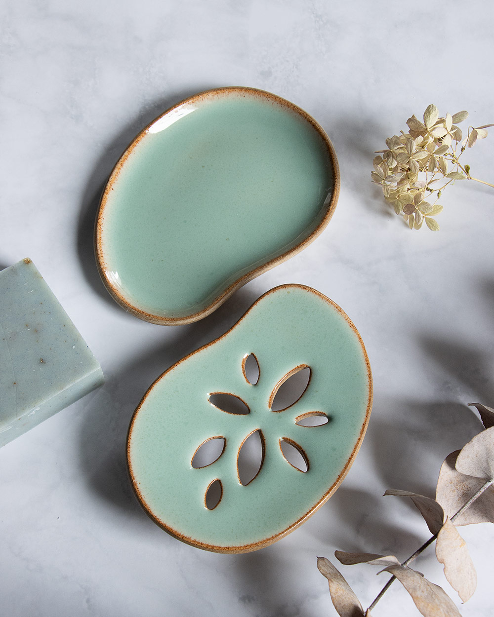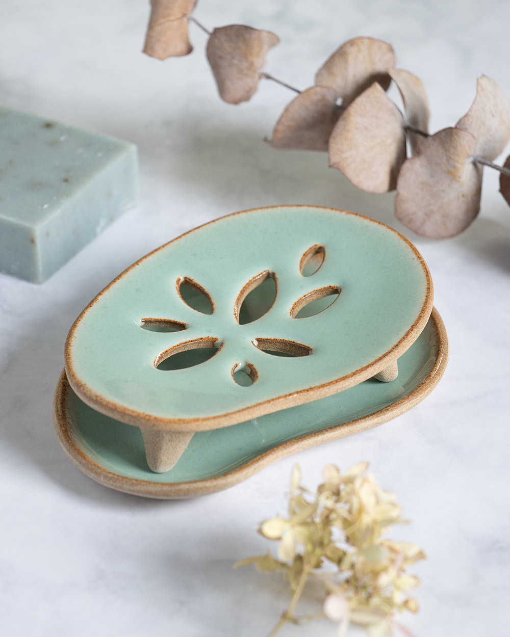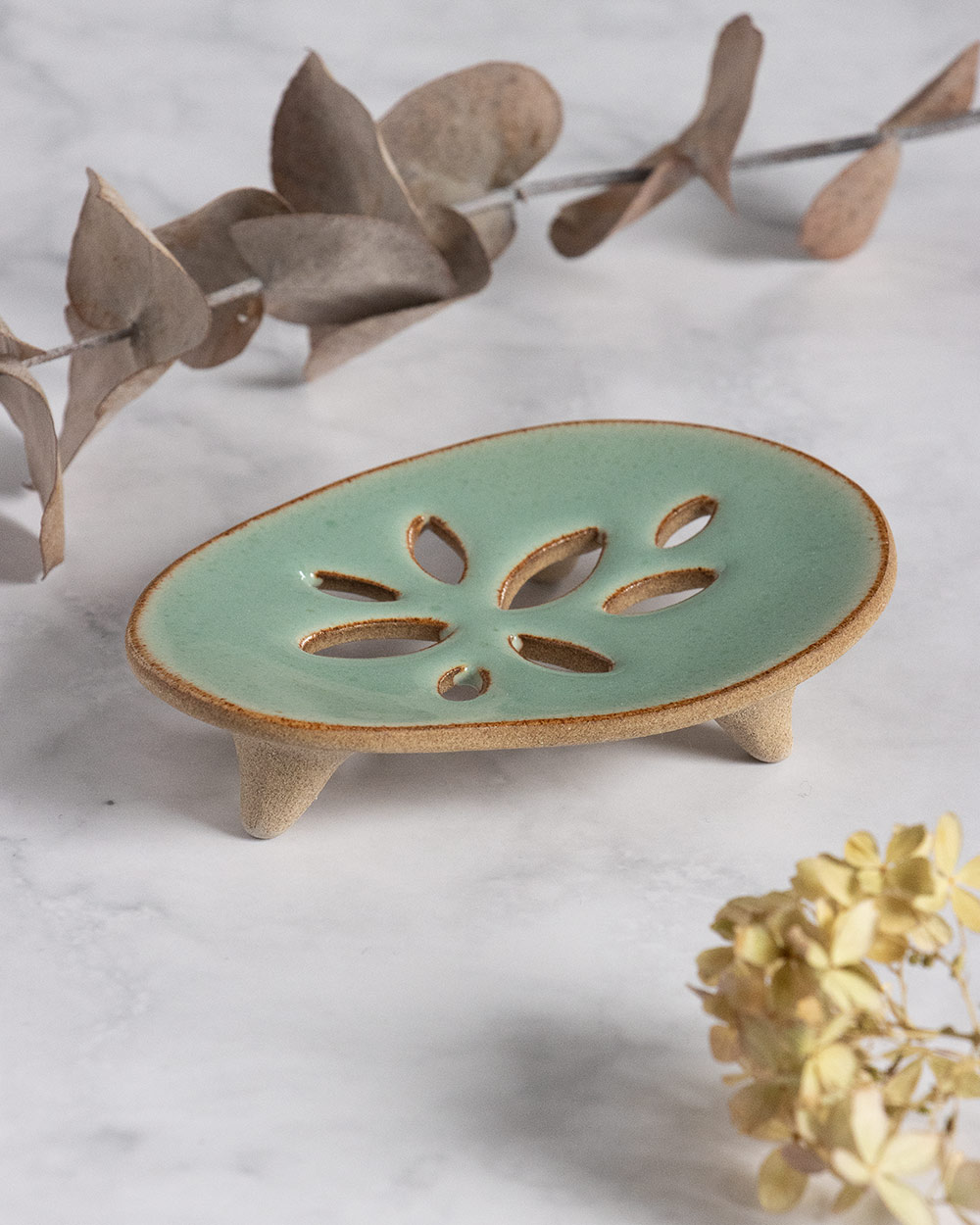Diese SEIFENSCHALE ist mit Hilfe der Plattentechnik entstanden. Ihre Form ist leicht gebogen und überschüssiges Wasser kann durch das handgeschnitzte Muster abfließen bzw. die Seife kann durch die Öffnungen auch von unten trocknen. Die Ablage hat drei Füßchen und ist auf der Unterseite unglasiert.