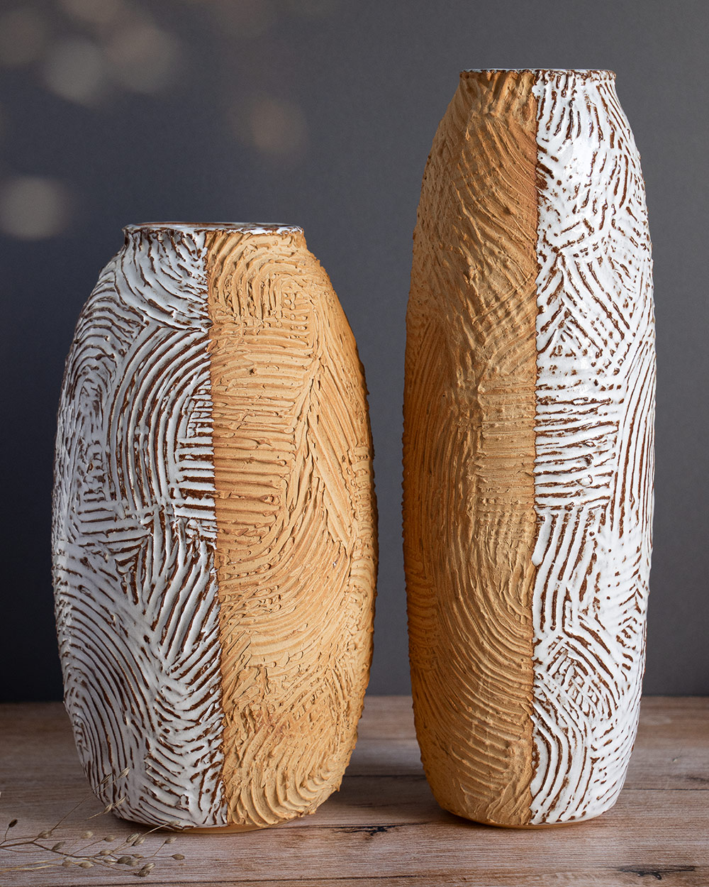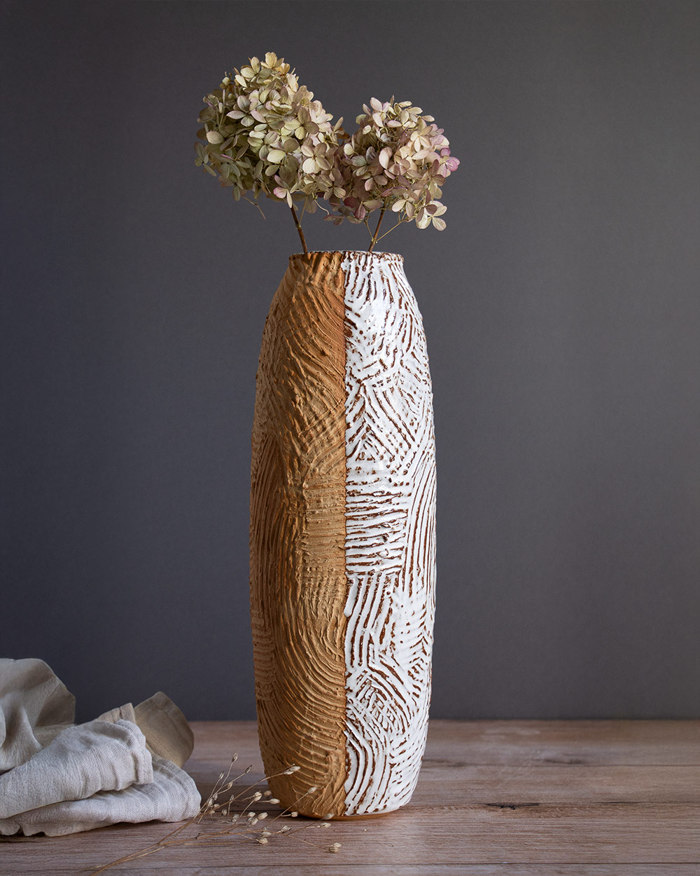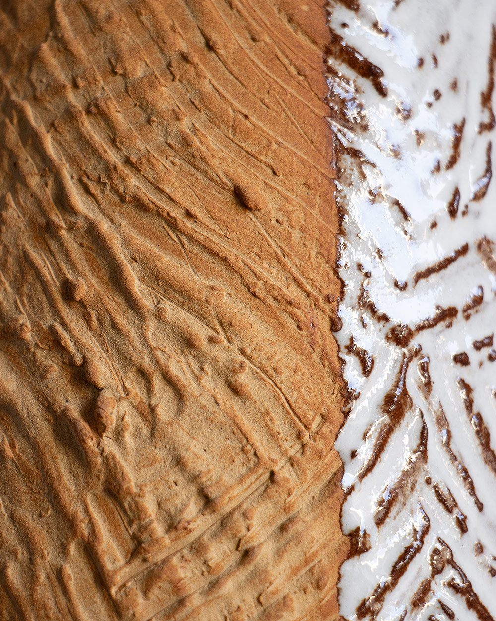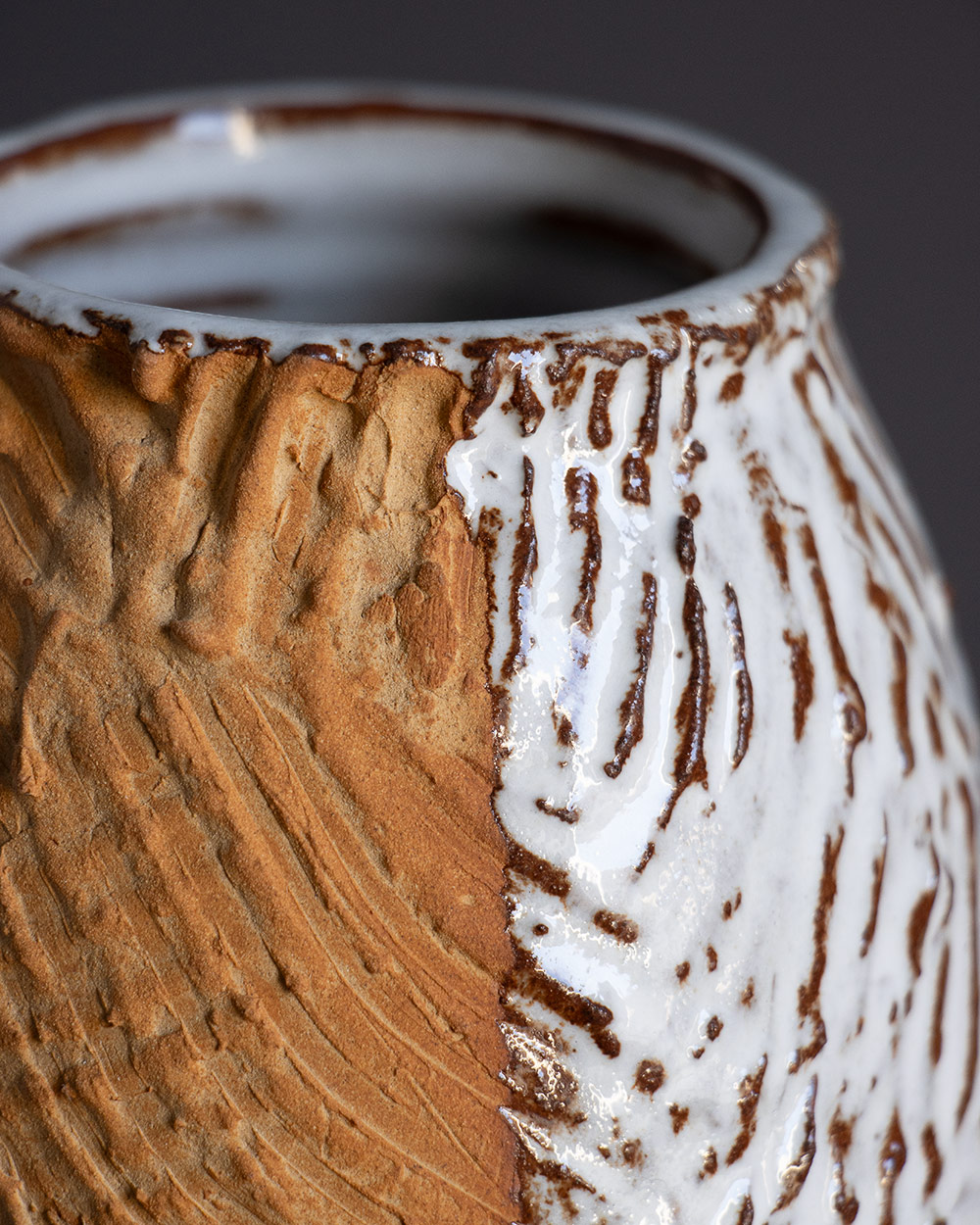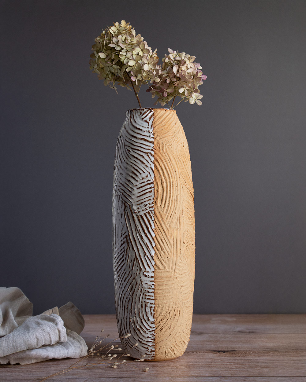 Diese große Vase wurde frei auf der Töpferscheibe gedreht. Anschließend wurde Tonschlicker mit einem selbstgemachten Werkzeug aufgetragen, sodass sie eine besondere Textur bekommt. Durch die vertikal genau zur Hälfte glasierte Oberfläche kann man zwischen verschiedenen Ansichten hin und her wechseln – je nachdem welche Seite man nach vorne dreht.