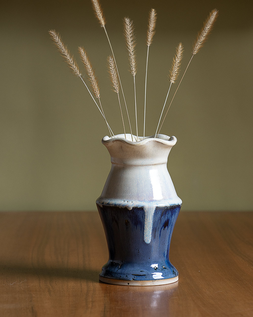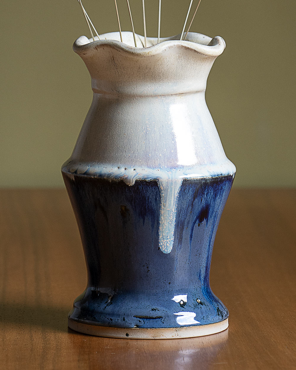 Diese Vase wurde auf der Töpferscheibe gedreht und anschließend noch vorsichtig am Rand oben verformt.
