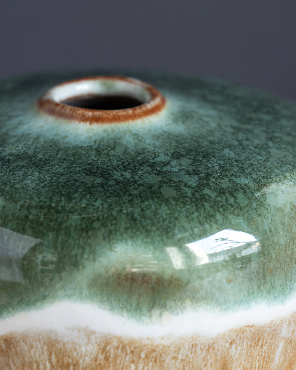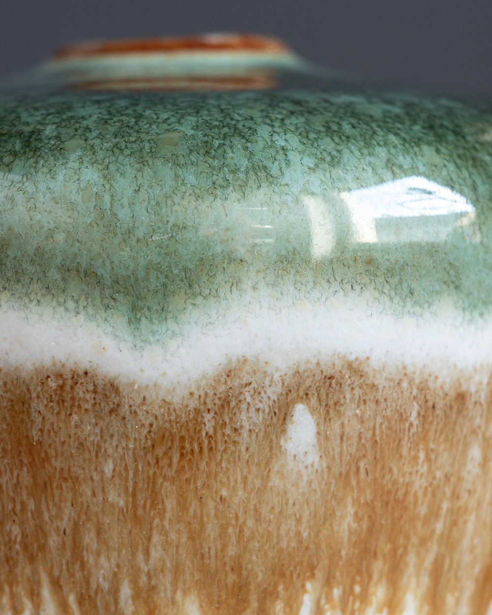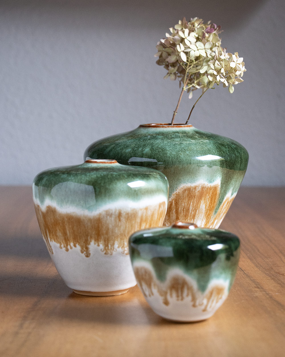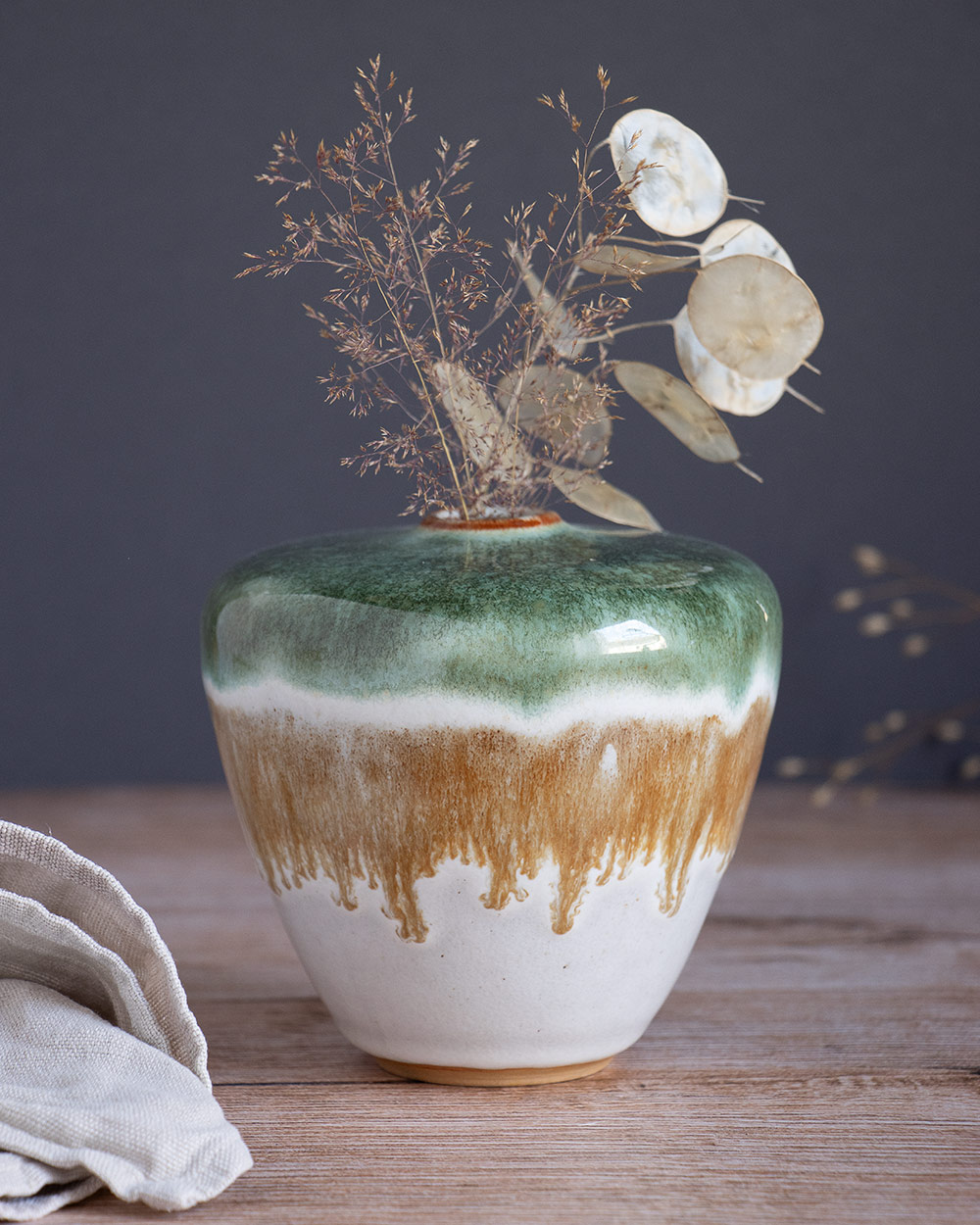 Diese V-förmige Vase wurde frei auf der Töpferscheibe gedreht. Ihre Form und der Glasur-Verlauf sind ein besonderer Blickfang.